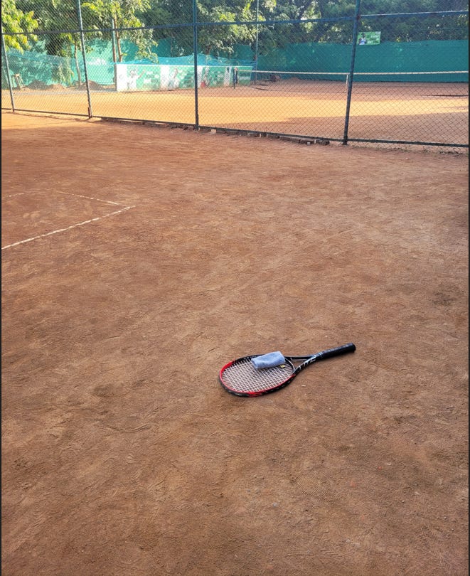 2023 marked the year I stepped back onto a tennis court for good. It feels strange to commemorate it as though it was a momentous return; it wasn’t. Much like writing for the past eight or nine years, tennis has been a constant in my life since I was about six years old, though its frequency and relative importance has ebbed and flowed. Even after years of regular coaching, which came to an end towards the business end of school, my racquet was never too far from sight, and ever since, tennis has always featured in my numerous plans to return to peak fitness. Against the run of play, tennis tapered off during my college years in Jodhpur, owing partly to the lack of suitable facilities and reliable partners, but mostly to an irresistible tendency to indolence which I developed during that time. I still played now and then, even competed in a couple of law school tournaments – quite well (though never ultimately in a winning cause) on some occasions, but rather poorly in my last outing at home in my final year, where I suppose my place in our tennis team was based less on outright ability and more on the efflux of time and a queer respect for my seniority.